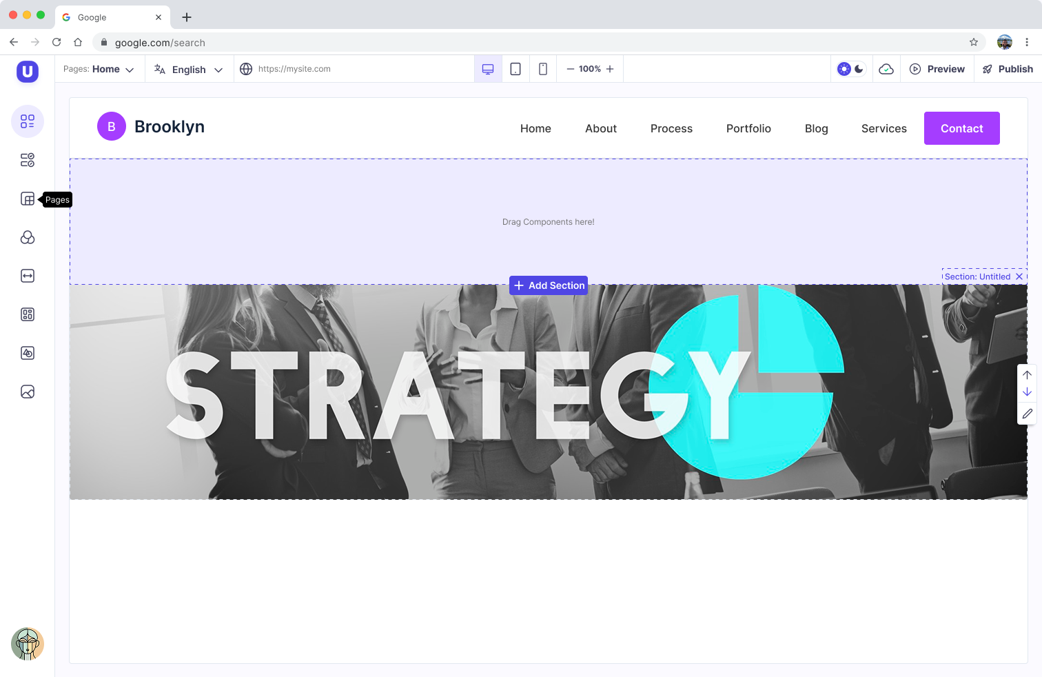 Live editable page showing real-time design changes. | Style customization tools (colors, fonts, spacing, alignment).